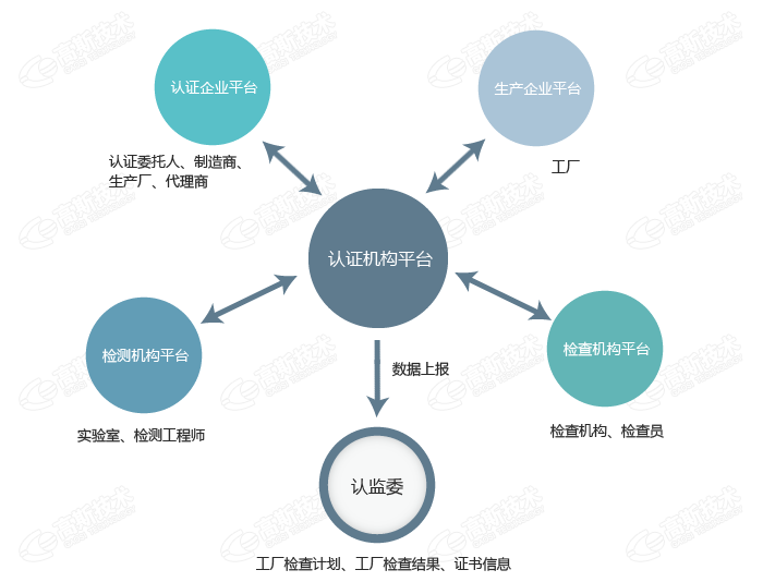 系统平台为认证业务相关的认证委托人、认证机构、实验室、检查员提供一个业务交互平台,通过本系统,认证委托人能够在线提交申请、查询进度,在线获取认证机构反馈信息及文件下载查阅功能;认证机构借助系统在线对认证委托人提交的申请进行资料审核处理,向实验室安排检测任务,实验室同步接受检测委托,进行样品收发处理,并可在线提交检测结果及报告;系统实现在线安排工厂检查员检查任务,检查员可在线提交工厂检查计划、检查人日数、提交工厂检查结果及报告等操作;并对实验室和工厂检查原提交的报告进行评价,签发认证证书以及获证后的监督检查安排等过程处理。